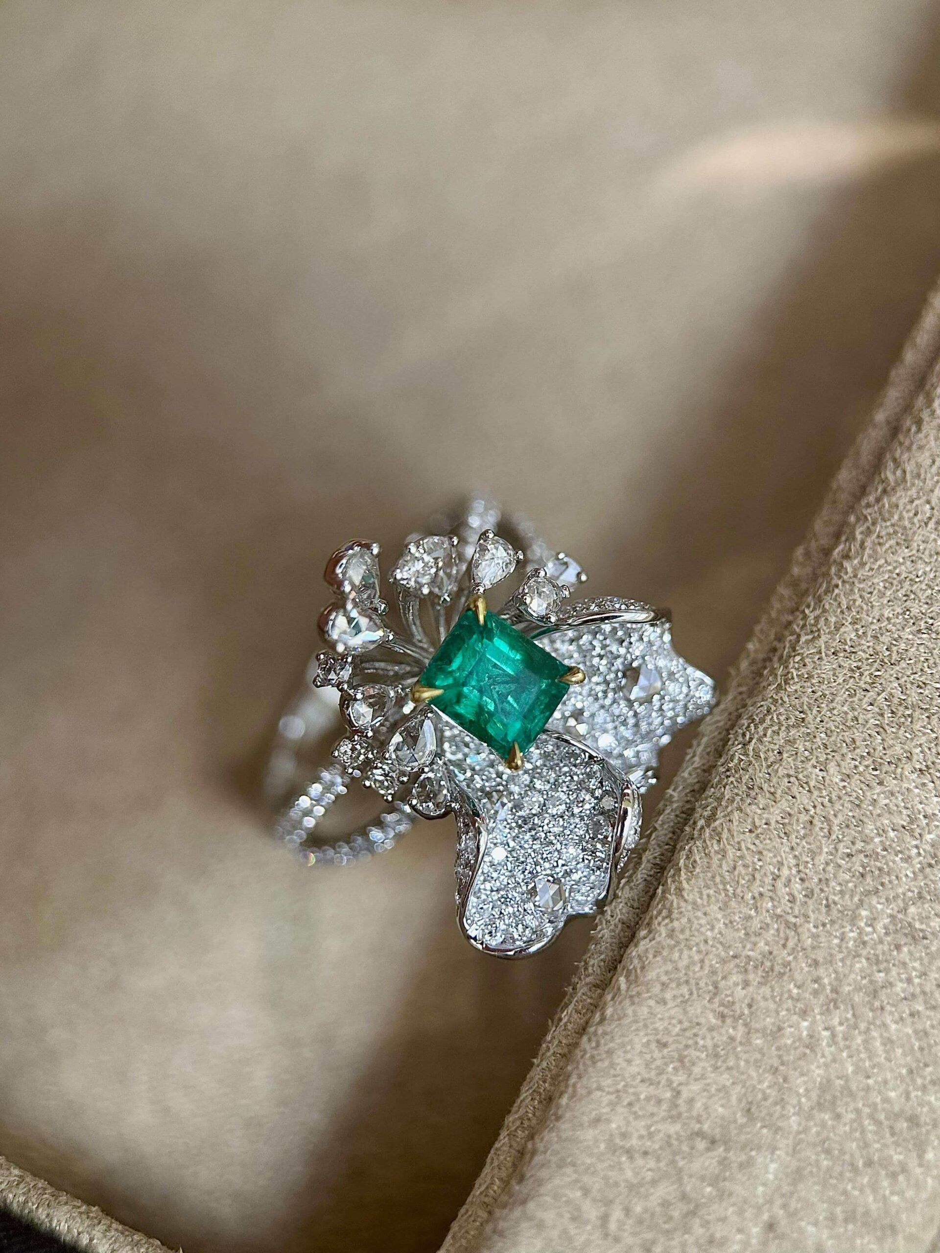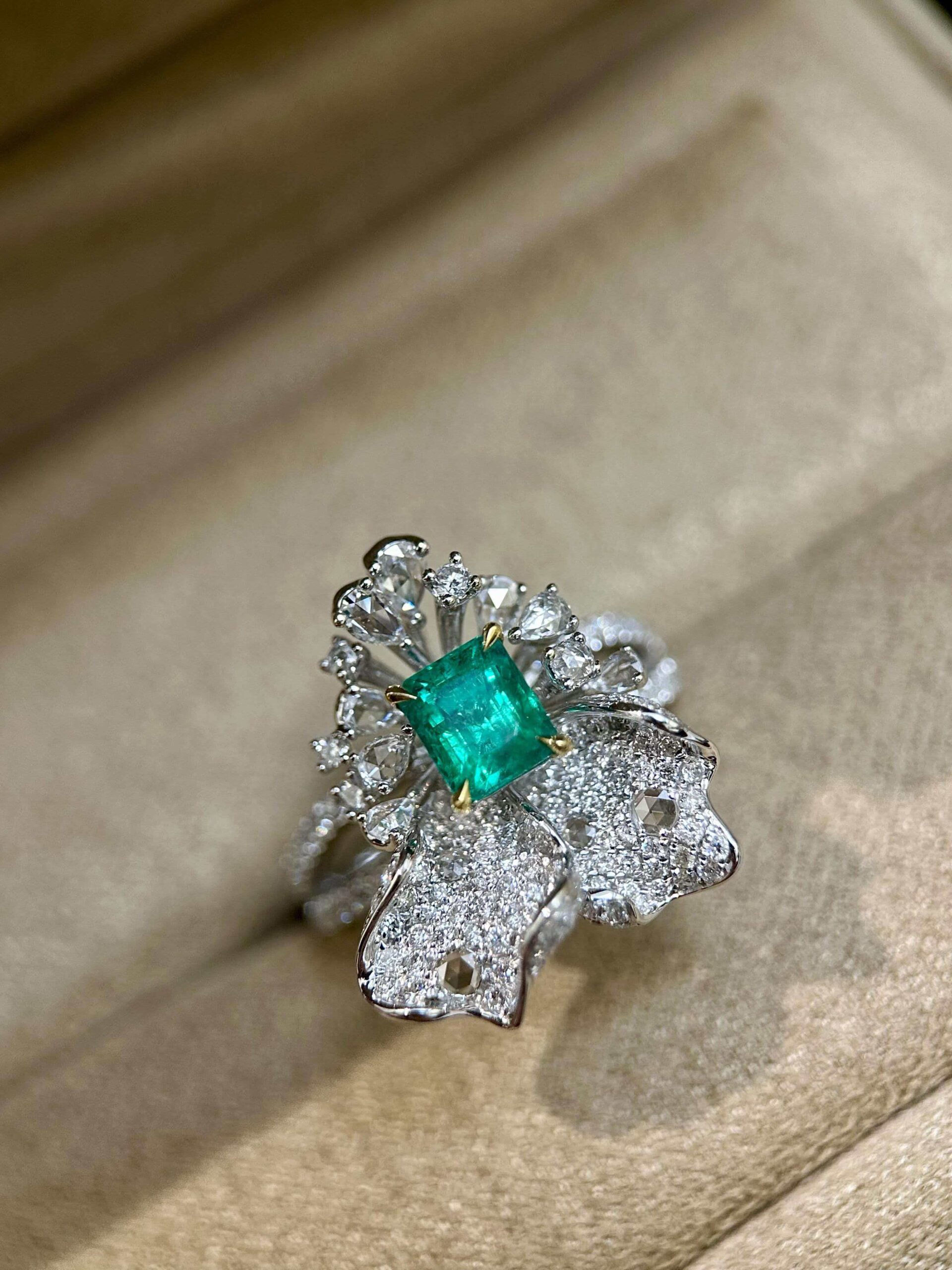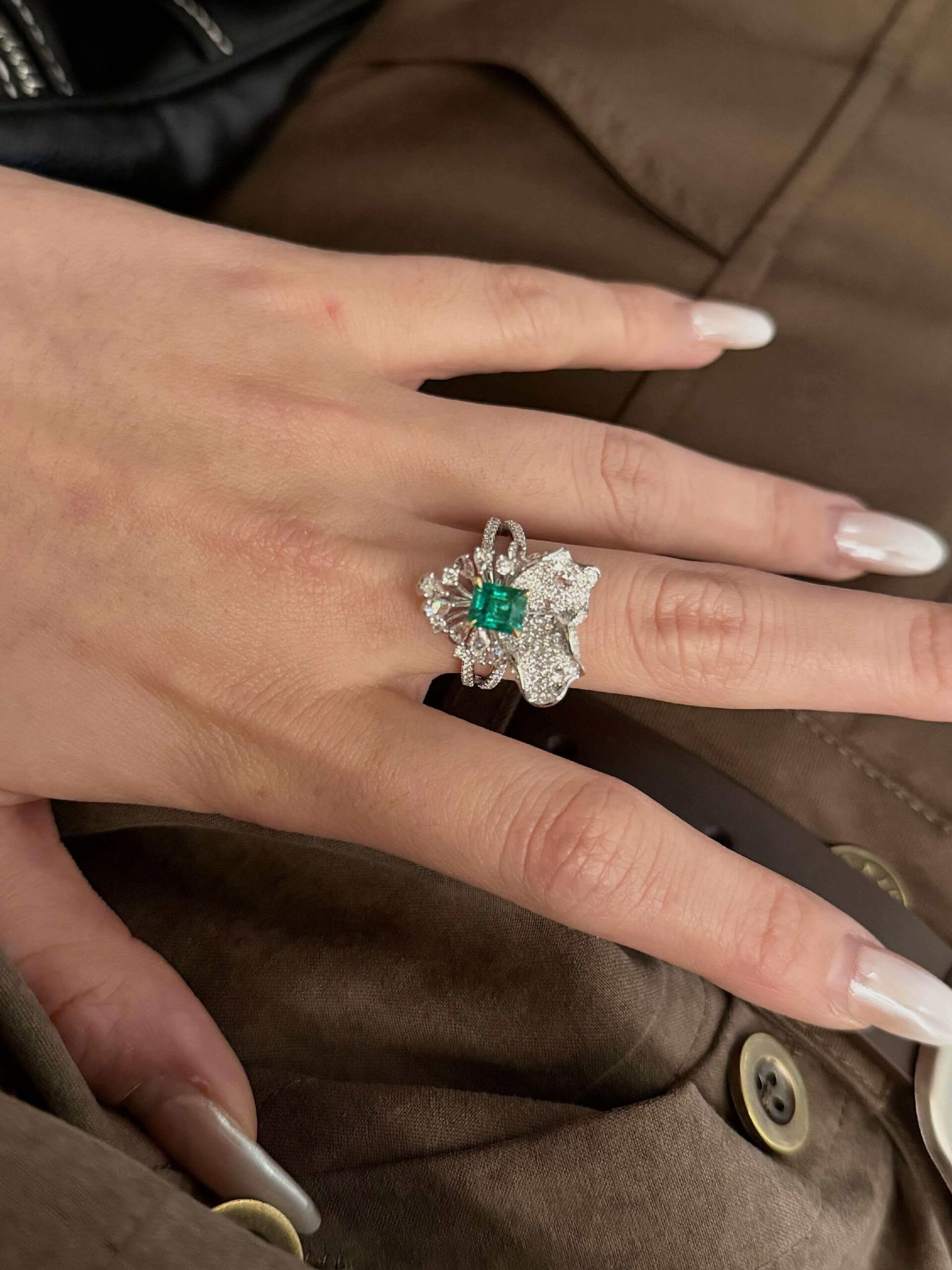 This enchanting ring centers on a vivid 1.2ct lab-grown emerald, paired with a whimsical 3D floral-leaf design — fusing ethical lab-grown luxury, intricate craftsmanship, and nature-inspired charm into a versatile piece that shines for both daily elegance and special moments.