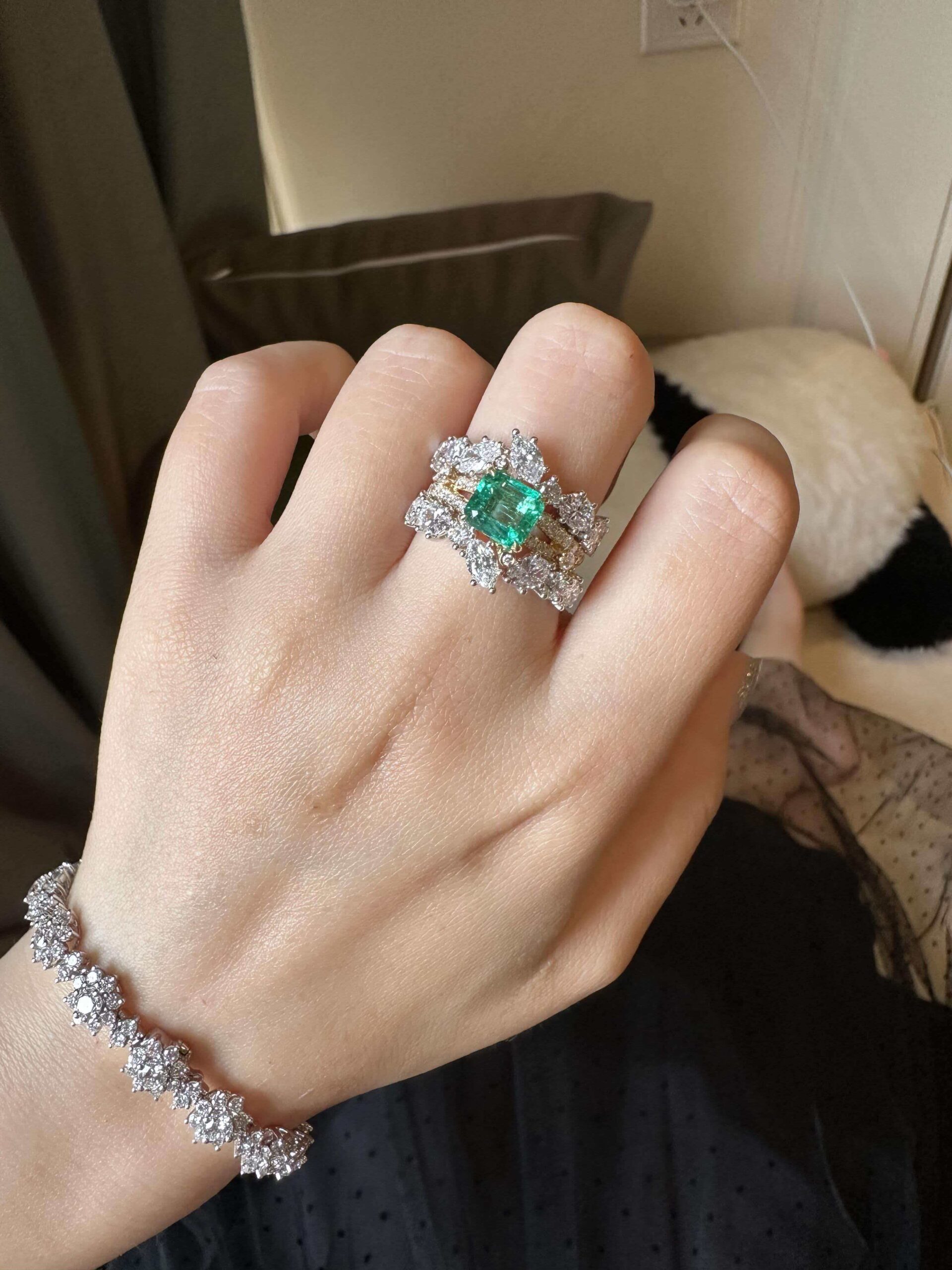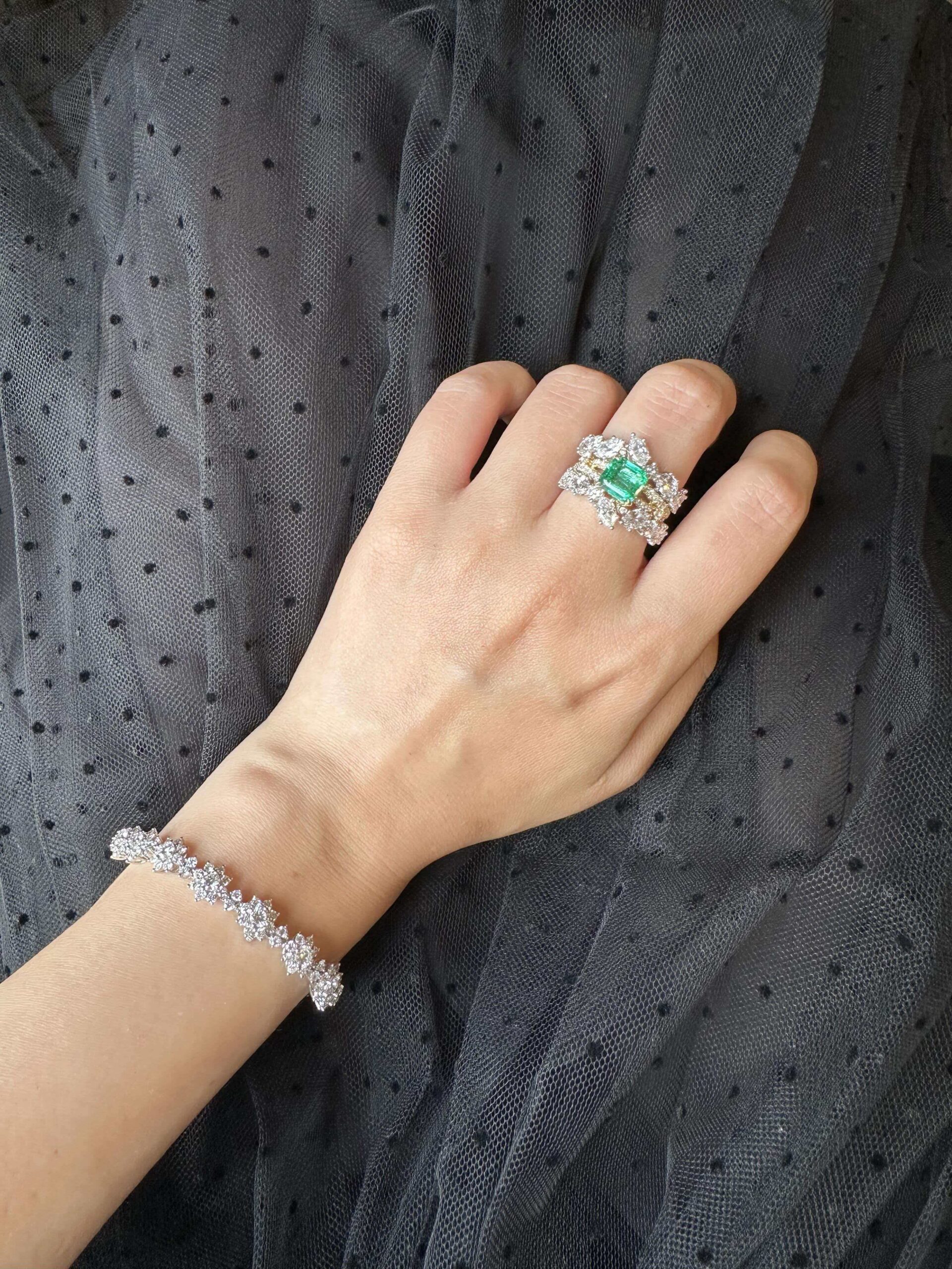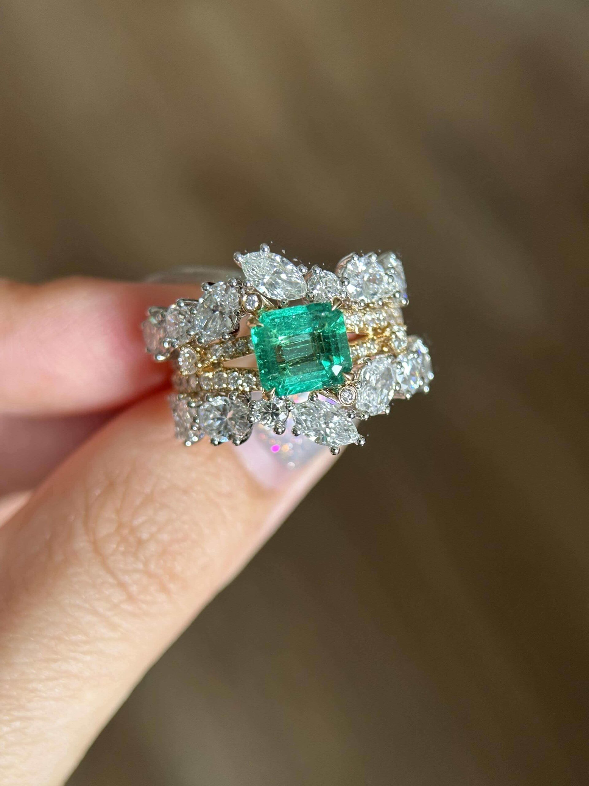 - Accent Stones: Mixed-cut lab-grown diamonds (pear & round shapes, VS clarity, F-G color) – clustered around the emerald and layered across the ring’s integrated bands for all-angle shimmer