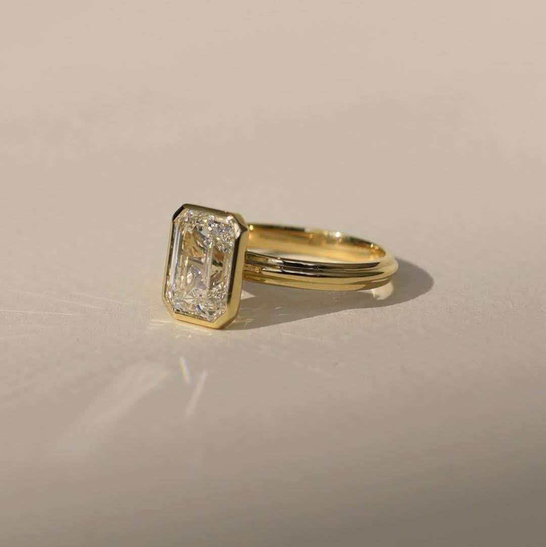 The ring features a sleek bezel-set + double-band silhouette: The 3-carat emerald-cut diamond is secured by a thin 14K gold bezel (framing its sharp, rectangular shape without obscuring its facets), paired with a slim double 14K gold band. The design prioritizes clean lines and modern minimalism—no extra embellishments, letting the diamond’s cut and quality take center stage.