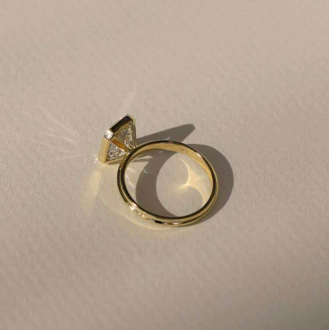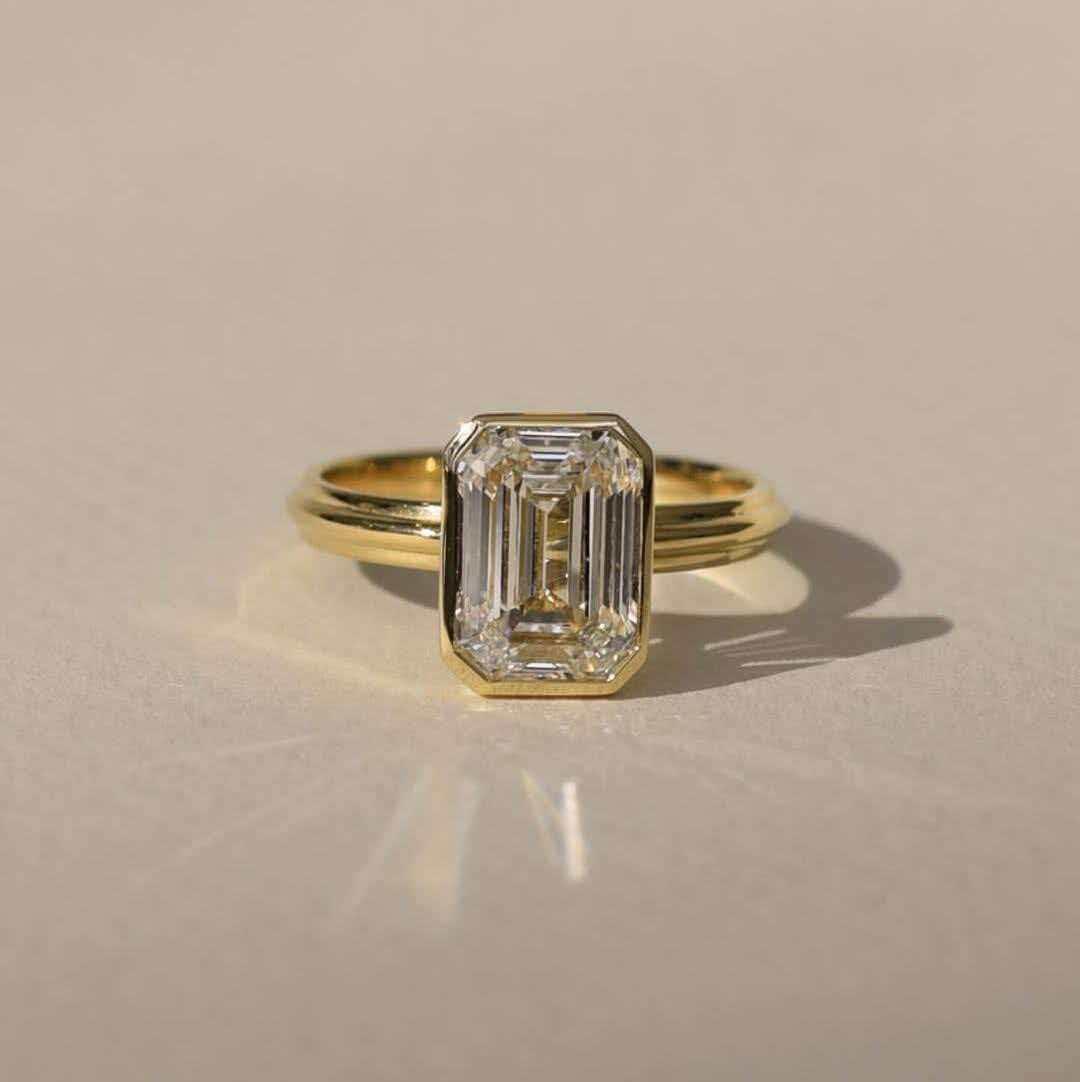 This minimalist, modern ring stars a 3-carat lab-grown emerald-cut diamond—set in sleek 14K yellow gold with a double-band silhouette—to highlight sharp geometric lines and understated luxury.