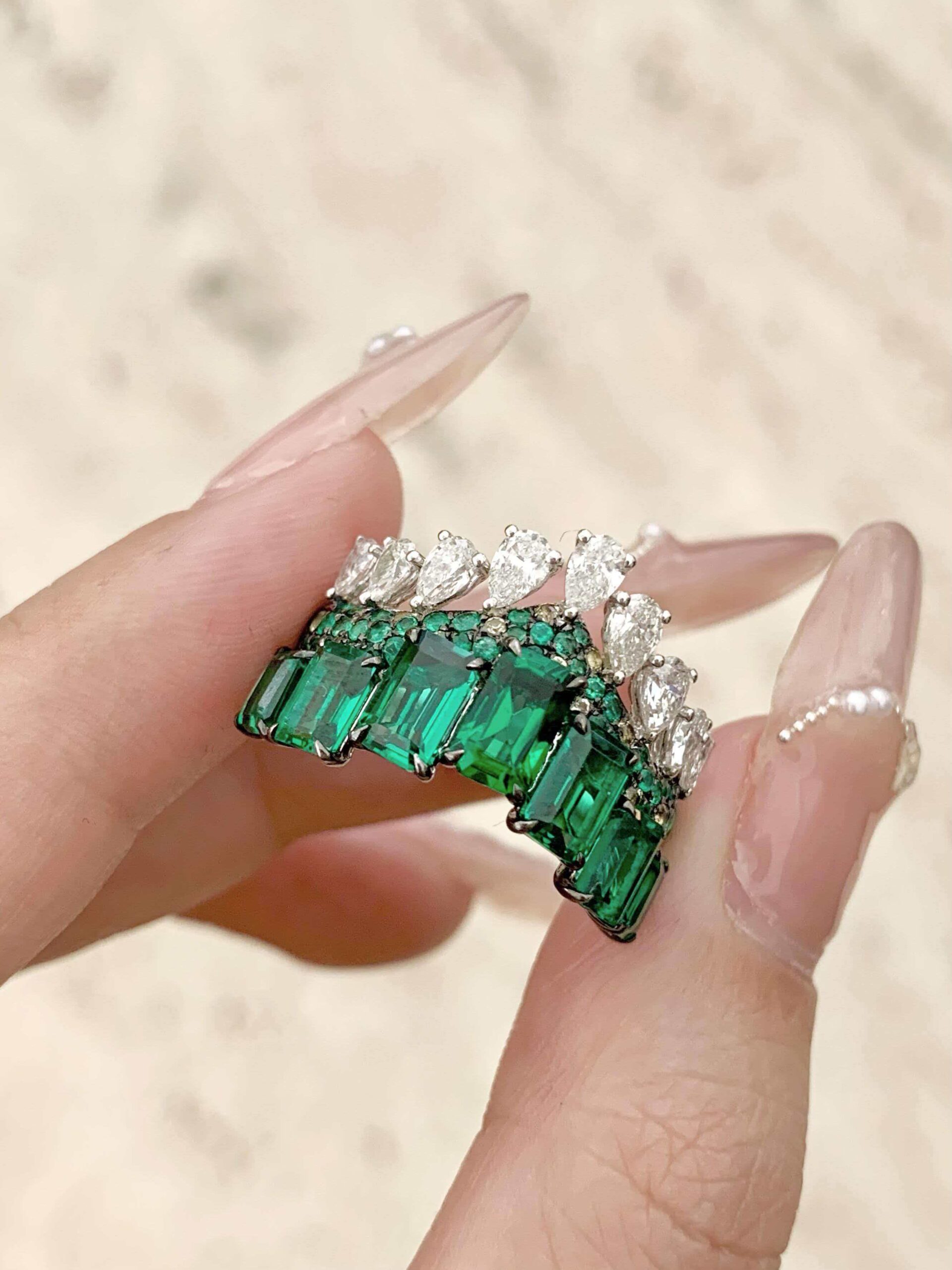 Pear Diamond Micro-Prong Setting: The pear-cut diamonds are held by delicate 14K white gold micro-prongs, with prongs concentrated at the pointed ends for security. Their teardrop shape faces the emerald’s center, creating a seamless visual flow from main stone to band.