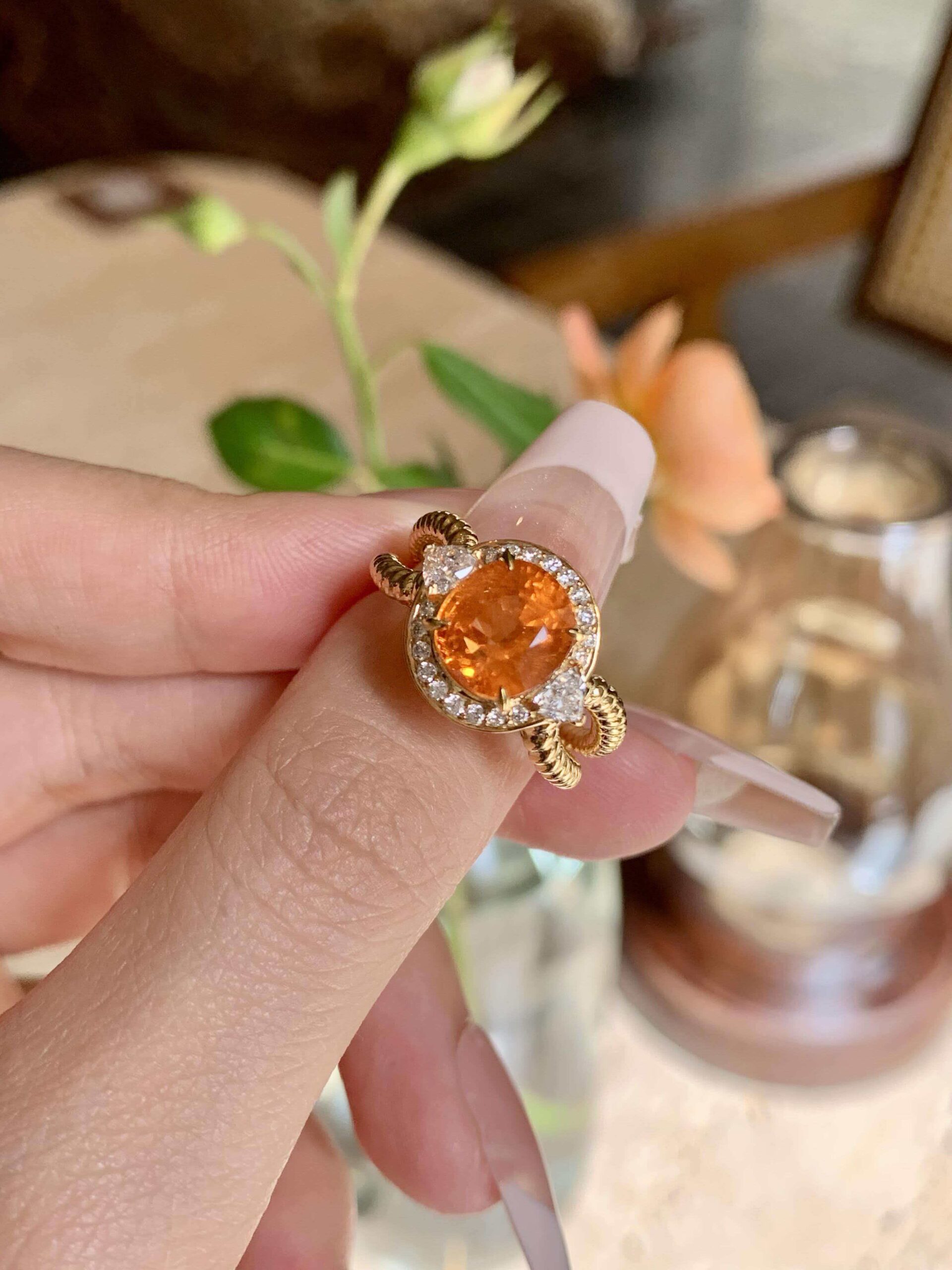 Setting Material: 14K Gold (textured brushed finish, with excellent durability and ductility. Its warm tone amplifies the fanta stone’s orange depth, creating a harmonious retro style)