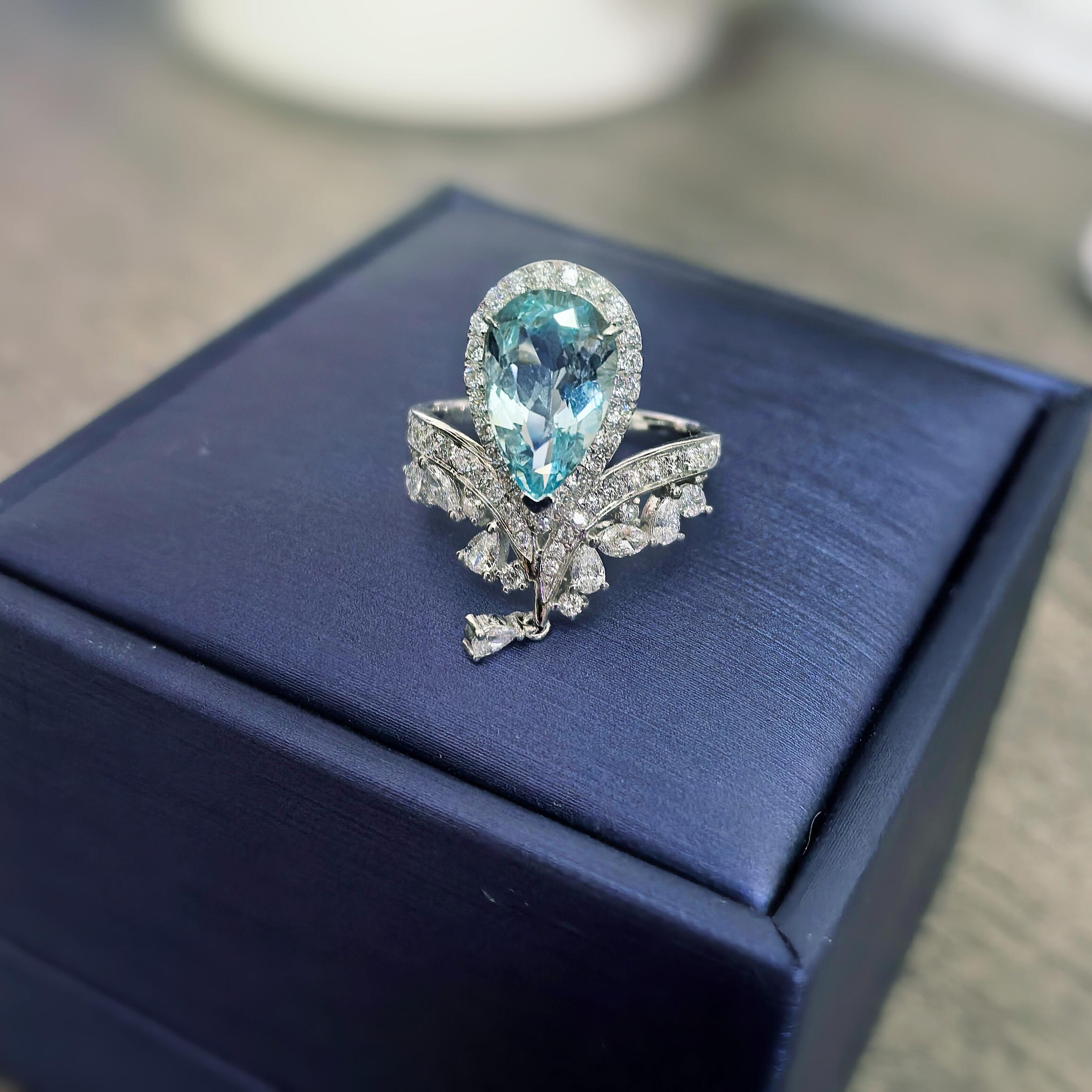 This premium statement ring features a 5-carat lab-grown aquamarine as the centerpiece, crafted in pear shape with VS2 clarity and set in premium 18K white gold, paired with lab-grown diamond accents (D-F color, VS1 clarity). The aquamarine’s bright sea-blue hue creates a harmonious contrast with the white gold’s cool luster and the diamonds’ brilliance, embodying the precision of lab-grown gem technology and modern jewelry craftsmanship—suitable for high-end occasions, milestone gifting and daily elegance.