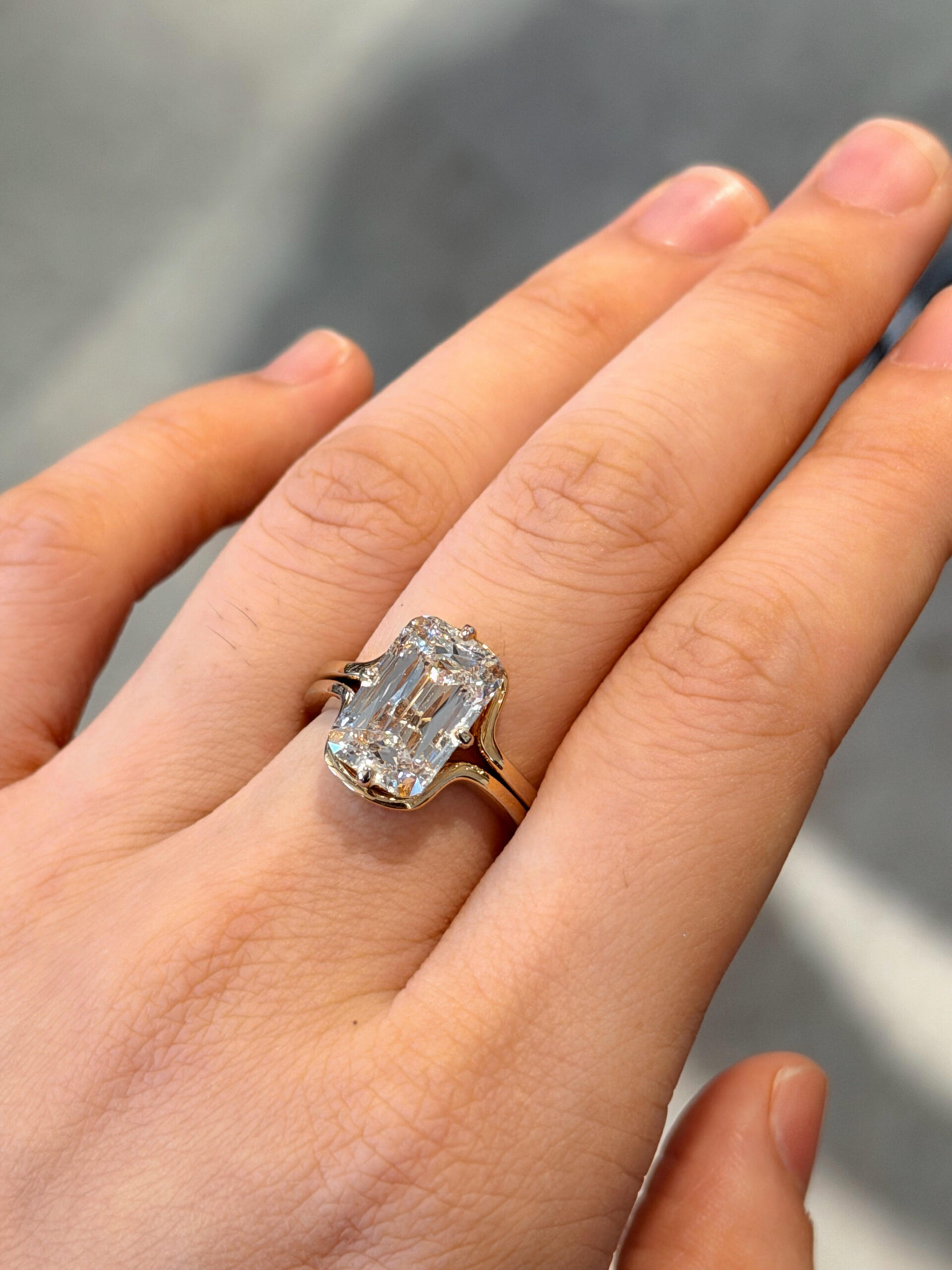 • Cut: Elongated Emerald Cut (extended length-to-width ratio, clean step facets, and sharp geometric lines, emphasizing the diamond’s transparency while creating a subtle “ice-like” luster and visually lengthening the finger)