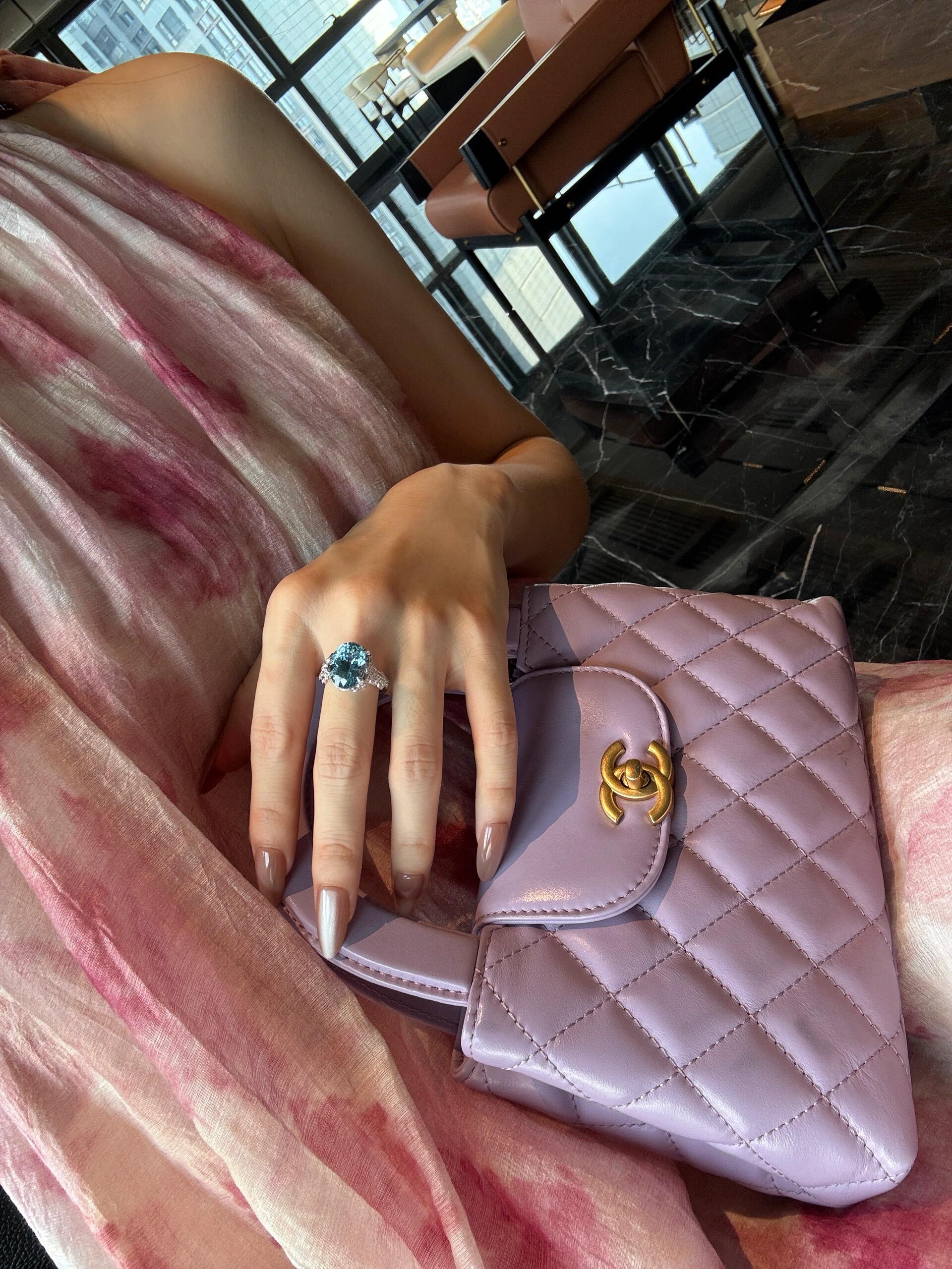This heirloom-quality statement ring features a 9.12-carat lab-grown Santa Maria Aquamarine as its centerpiece, crafted with an oval cut and VS2 clarity. It is paired with an 18K white gold setting and lab-grown diamond accents (D-F color, VS1 clarity). The aquamarine’s iconic sky-blue hue creates a harmonious resonance with the cool luster of white gold and the fire of diamonds, embodying both the precise craftsmanship of lab-grown gemstones and the exquisite artistry of high-end jewelry. It is suitable for red-carpet events, milestone celebrations, and collection purposes.