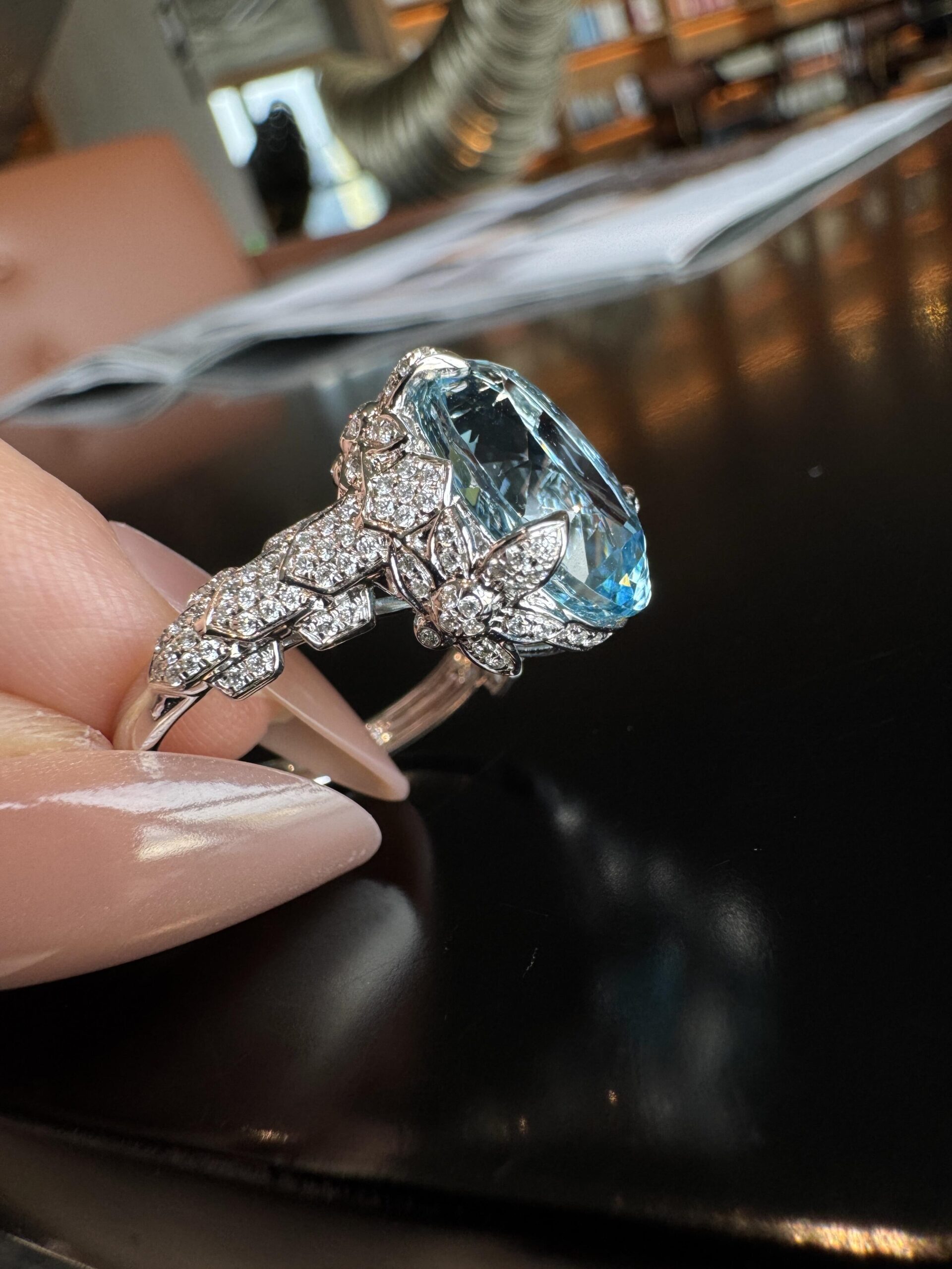 Accent Details: Lab-grown diamonds (symmetrically set on the ring shoulders and along the band’s edge, forming a delicate halo that highlights the aquamarine’s clear blue hue)
