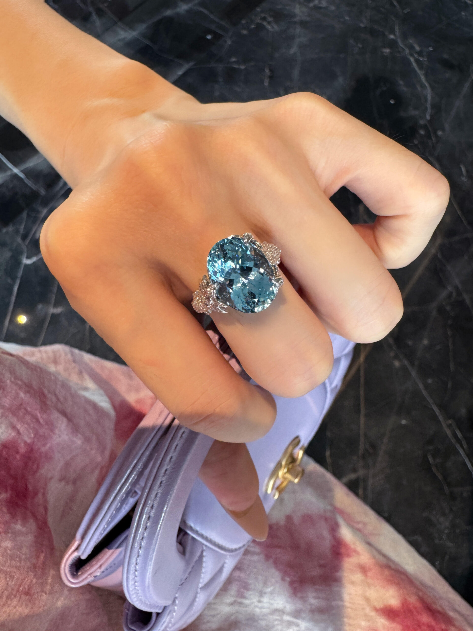 Structured Solid Band: The 18K white gold band maintains a 2.5mm uniform width from setting to shank, with a high-gloss polished surface that mirrors the aquamarine’s radiant glow. The minimalist structure ensures the large Santa Maria gem remains the visual core, adhering to high-jewelry design principles.